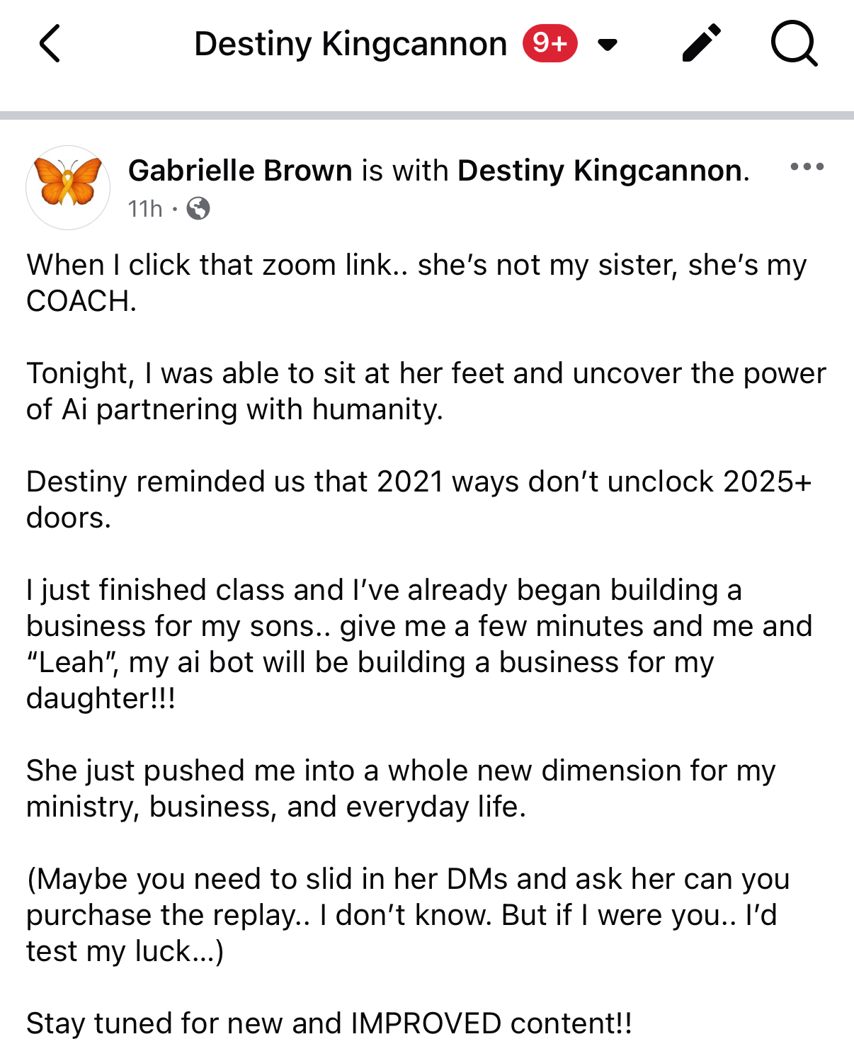 Her journey into AI began during one of the hardest seasons of her life. After uprooting her world to return home and serve as a full-time caregiver for her mother, who recently passed away from cancer, Destiny found herself rebuilding her life and relaunching her business at the same time. The mental fog, the pressure, and the loss left her without the motivation she once carried so easily.