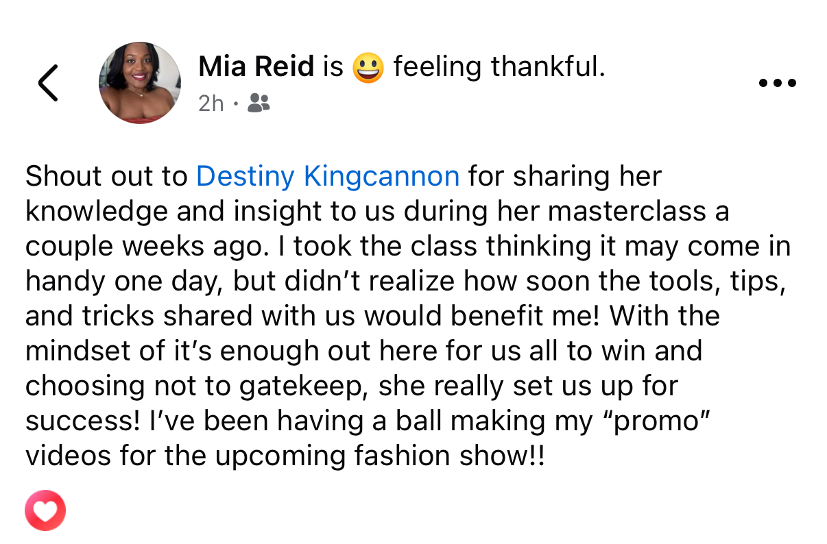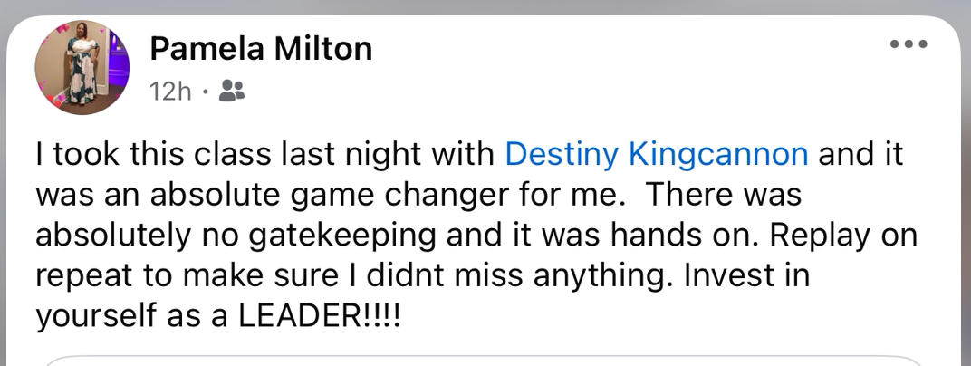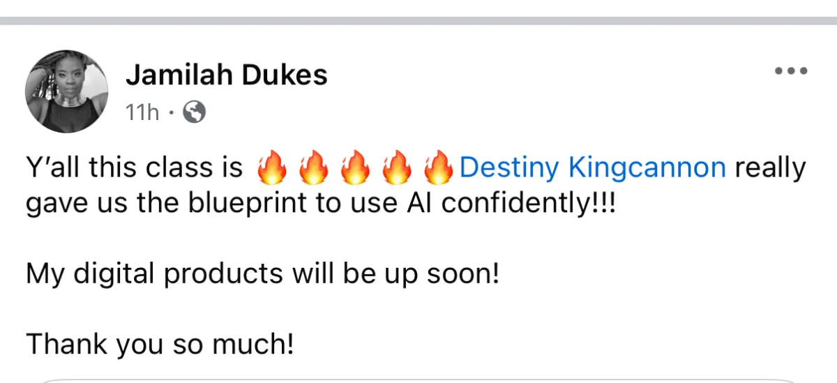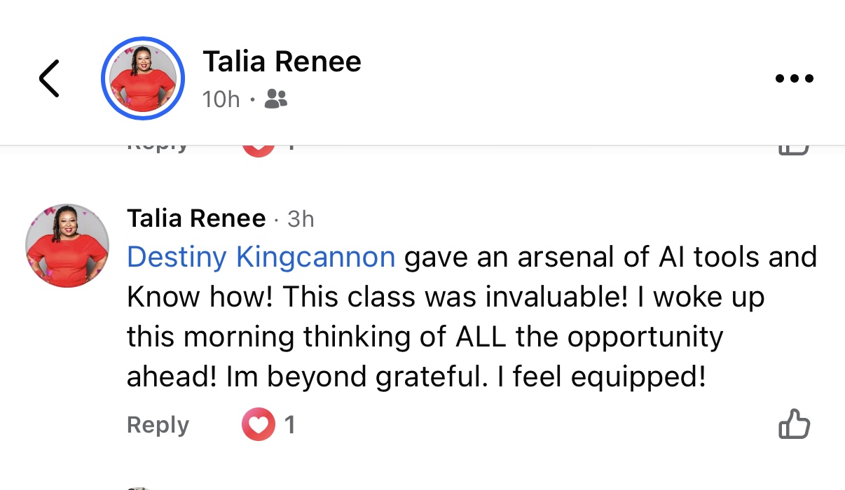 Destiny has helped clients scale to six figures, increase their visibility, master self confidence, step into higher-paying roles, and use practical AI strategies.